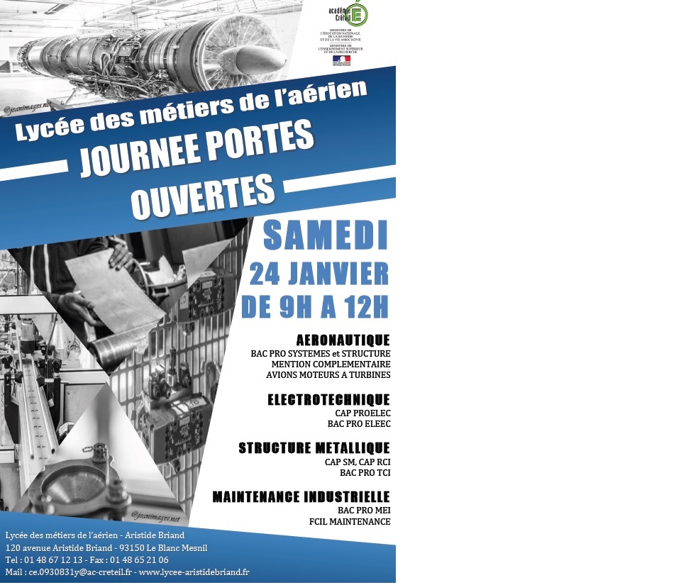 Le lycée A. BRIAND des Métiers de l'Aérien, organise sa journée portes ouvertes le samedi 24 janvier de 9 h 00 à 12 h 00.